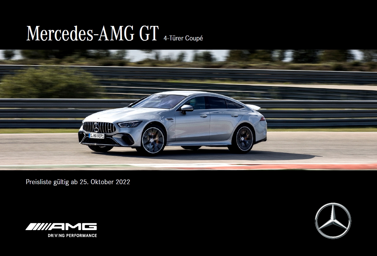 | 05.10.2022 - 17.05.2022 akt. | Mercedes-AMG GT 4-Türer Coupe. Preisliste. (Aktualisierung auf der hinteren Umschlagseite) | Coupe 4-türig | 73 |