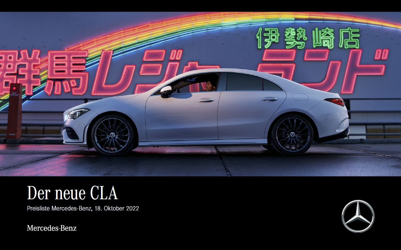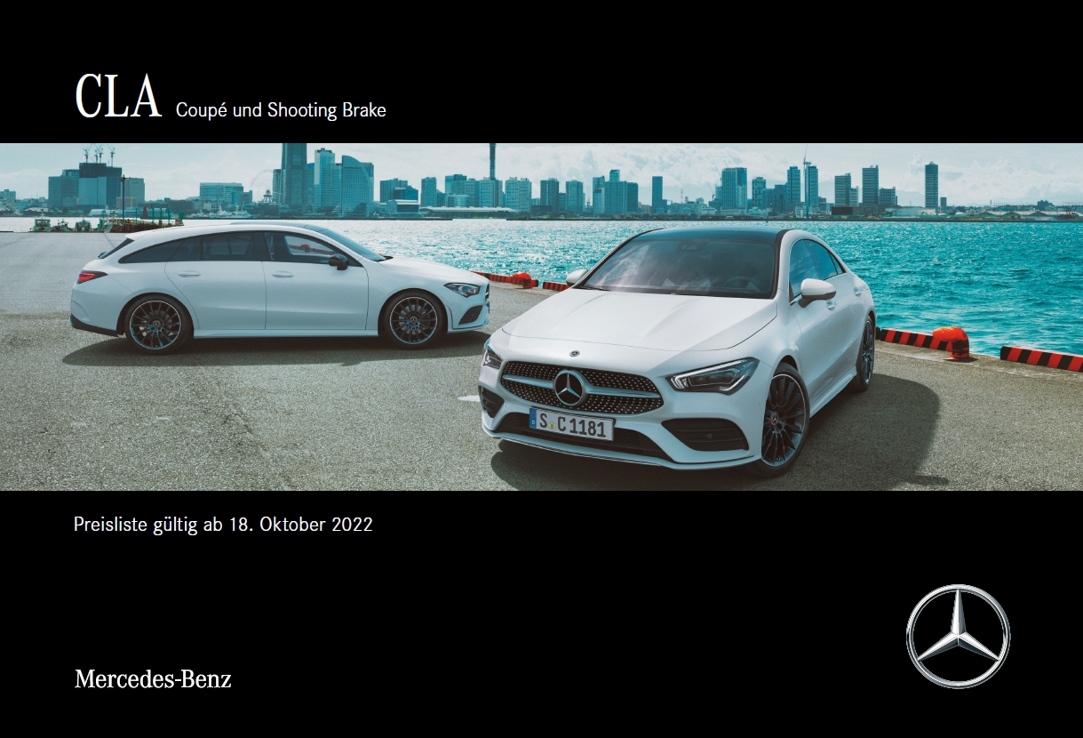 | 22.11.2022 - 18.10.2022 akt. | CLA Coupe und Shooting Brake. Preisliste. (Aktualisierung auf der hinteren Umschlagseite) | Coupe 4-türig ; Shooting Brake | 93 |